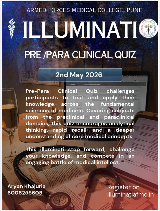 The Pre-Para Clinical Quiz at Illuminati 2026 brings together foundational and clinical sciences in an exciting test of knowledge. It challenges participants to integrate concepts from pre-clinical and para-clinical subjects, promoting analytical thinking, teamwork, and a deeper understanding of the scientific basis of medicine.